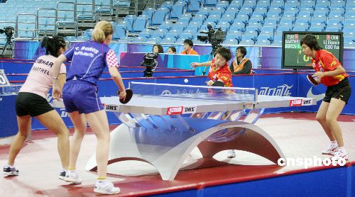 12月18日,奧運測試賽乒乓球女團比賽揭幕。第三場進行的是雙打比賽,中國隊派出郭躍/李曉霞這對雙打組合,而歐洲聯隊一方則是鮑羅斯和孫禎琦的組合,雖然首局在拿到局點的情況下被對手以12比10逆轉,但郭躍和李曉霞調整心態的速度非常快,她們以11比7,11比5和11比2連下三局,以3比1戰勝鮑羅斯/孫禎琦,從而使得中國女隊以3比0輕取歐洲聯隊,取得本次邀請賽的開門紅。中新社發 博芽影像 攝
