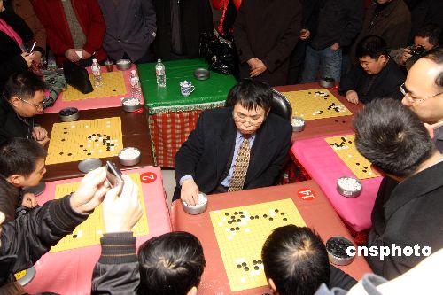 1月15日,聶衛平在湖南漣源市與5位棋手展開車輪大戰。當日,聶衛平與漣源市迎奧運首屆“九龍杯圍棋大獎賽”冠軍胡軍民、亞軍潘勇、劉小希等5位棋手展開車輪大戰。聶衛平分別讓給他們2-4個子,經過2個多小時的決戰,聶衛平“輸”給胡軍民、潘勇、劉小希3人,贏取另2人。賽后聶衛平為婁底市百多名棋手講解精彩圍棋。中新社發 郭國權 攝