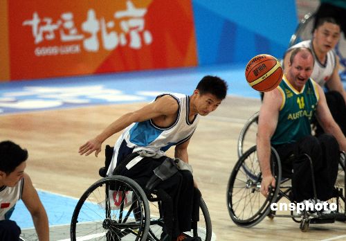 好運(yùn)北京-2008國際輪椅籃球邀請(qǐng)賽,1月20日在北京奧運(yùn)會(huì)主要賽場-國家體育館舉行。此次賽事的主旨是全面檢測北京殘奧會(huì)比賽的各個(gè)環(huán)節(jié),北京殘奧會(huì)的輪椅籃球賽事就在該體育館舉行。圖為世界勁旅澳大利亞隊(duì)(綠)與中國隊(duì)在男子比賽中。中新社發(fā) 任晨鳴 攝