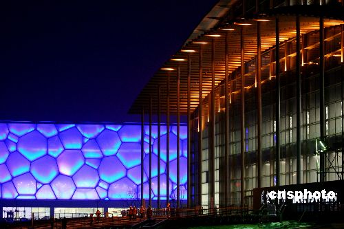 1月21日,北京奧林匹克公園內的北京奧運會游泳館-水立方進行夜景燈光調試,迎接1月31日在這里舉行的“好運北京”中國游泳公開賽。中新社發 富田 攝