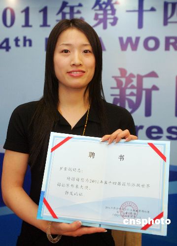 1月31日,泳壇名將羅雪娟成為2011年第14屆國際泳聯(lián)世界錦標(biāo)賽形象大使。當(dāng)日,2011年第14屆國際泳聯(lián)世界錦標(biāo)賽組委會在上海正式成立,此舉標(biāo)志著將于2011年7月在上海舉行的該項(xiàng)賽事的籌備組織工作正式啟動。中新社發(fā) 湯彥俊 攝