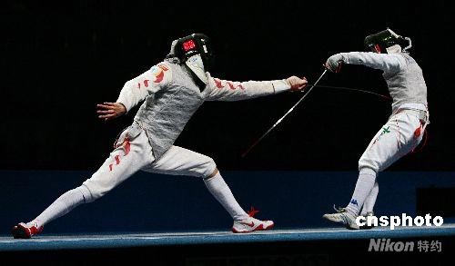 4月18日,“好運(yùn)北京”2008國際劍聯(lián)世界錦標(biāo)賽在國家會(huì)議中心擊劍館打響,首先進(jìn)行的是男子花劍團(tuán)體的比賽,在1/4決賽中,雅典奧運(yùn)會(huì)團(tuán)體金牌得主意大利隊(duì)(右)以45-33的比分戰(zhàn)勝了東道主中國隊(duì)(左),率先挺進(jìn)4強(qiáng)。中新社發(fā) 富田 攝