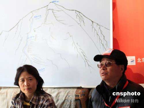 5月7日,在經(jīng)歷了一場大雪后,珠峰地區(qū)已經(jīng)連續(xù)3天晴好。中國登山隊發(fā)言人張志堅(右)在珠峰大本營絨布新聞中心詳解了登珠峰路線圖,并指出沿途有三大難點。他還指出,對這個路線,可以說是“輕車熟路,但是有一定困難”。中新社發(fā) 盛佳鵬 攝