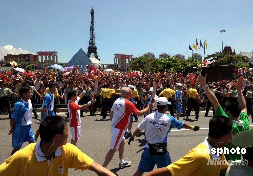 5月8日,奧運圣火在深圳進行傳遞。在深圳世界之窗門前芬蘭籍火炬手芬蘭前奧委會主任塔帕尼·愛爾卡與火炬手高正榮交接后向前傳遞圣火。中新社發 廖攀 攝