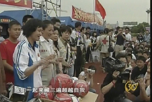 為了讓地震幸存者的心理創傷早日愈合,一支由奧運冠軍組成的特別的心理救援團抵達四川災區為當地受災民眾帶去心靈的寬慰。圖為在四川綿陽受災群眾安置點,奧運冠軍高敏、楊揚帶著孩子們高呼“超越自我”。