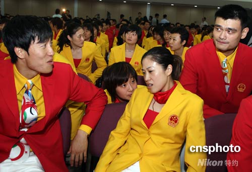 7月25日,參加北京奧運會的中國體育代表團在北京正式成立,兩位中國人氣最高的體育明星劉翔與姚明用上海話嘮家常。 中新社發 任晨鳴 攝