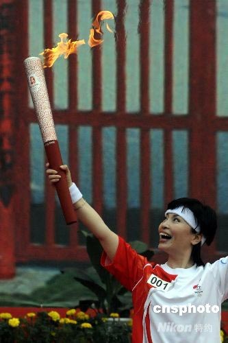 7月28日,中國中央電視臺新聞播音員李瑞英,作為河南安陽的第一棒火炬手,高舉北京奧運火炬開始安陽火炬傳遞。 中新社發 慎重 攝