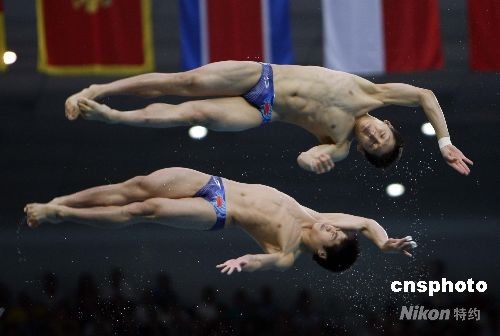 8月11日,中國選手林躍、火亮獲得北京奧運會男子10米雙人跳臺跳水金牌。中新社發 杜洋 攝