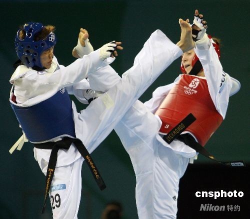 8月21日,北京奧運(yùn)跆拳道女子57公斤級比賽在北京科技大學(xué)體育館舉行,在銅牌爭奪賽中,中華臺北隊(duì)蘇麗文(藍(lán)方)不敵克羅埃西亞選手。中新社發(fā) CNAsports 攝