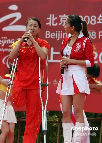 九月一日,北京殘奧會助威團(tuán)形象大使金晶(左),在上海助陣殘奧會火炬接力活動。當(dāng)日,北京殘奧會火炬接力“時(shí)代風(fēng)采線”第三站傳遞活動,在上海松江新城大學(xué)園區(qū)進(jìn)行,共有六十名火炬手參加。其中,殘疾人員有10名,其余為助殘、幫殘的先進(jìn)代表和基層殘疾人事業(yè)工作者。中新社發(fā) 湯彥俊 攝