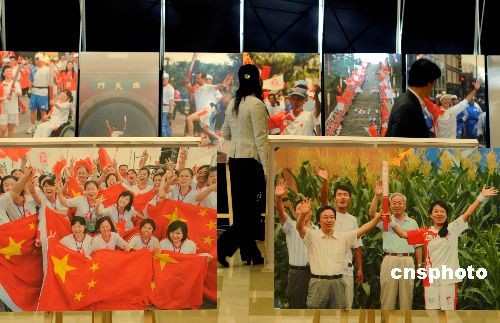 圖為在總結(jié)大會上,火炬接力的圖片展覽。