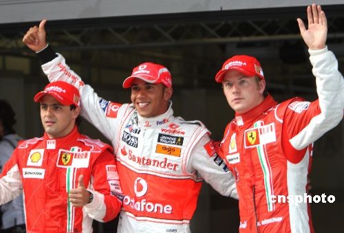 2008賽季F1第17站中國大獎賽10月18日在上海國際賽車場進行,邁凱輪車隊漢密爾頓以領先0.3秒的優勢連續第二年在上海國際賽車場拿到中國站的桿位,法拉利雙雄萊科寧和馬薩分居二、三位。中新社發 趙振清 攝