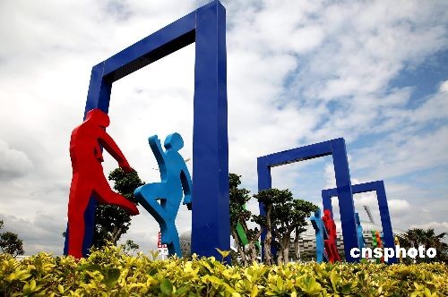十月十九日,一組全新的中國農運會比賽項目雕塑群,亮相福建泉州海峽體育中心外,引人注目。七天后,第六屆中國農運會將在此揭幕,開始自行車載重、民兵軍事三項、龍舟等十五個項目的角逐。中新社發(fā) 傅丹丹 攝