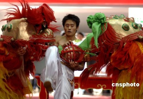 10月27日上午,第六屆全國農運會各項賽事相繼開賽。圖為精彩的舞獅比賽中北獅規定套路的決賽。中新社發 王東明 攝
