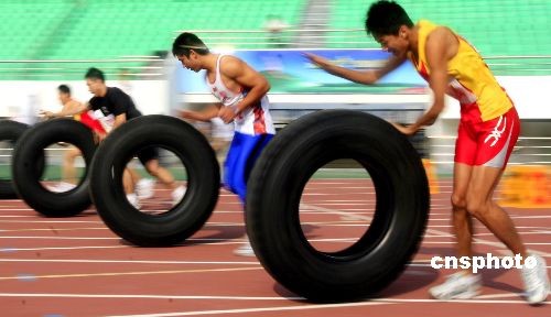 十月三十日,第六屆全國農民運動會田徑比賽在福建泉州海峽體育中心拉開帷幕后,進行了技巧性極高的男、女100米推輪胎賽跑比賽。圖為運動員在推輪胎賽跑。中新社發 傅丹丹 攝