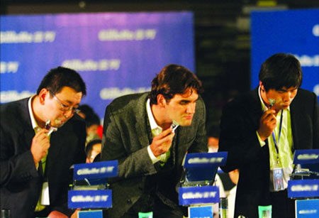 一通大山侃完,費(fèi)德勒開始跟大學(xué)生代表近距離互動,這次他送出的禮物是自己當(dāng)場簽名的《費(fèi)德勒自傳》。最后的剃須環(huán)節(jié)則與去年完全一致,費(fèi)德勒一手拿著麥克風(fēng)一手拿著剃須刀“言傳身教”,告訴學(xué)生們哪些是正確的剃須方式,哪些是不該養(yǎng)成的壞習(xí)慣。臺下千余人集體效而法之,人人下巴上沾滿白色潔面膏的場面猛一看去,倒也蔚為壯觀。特派記者 劉皓