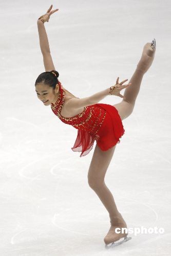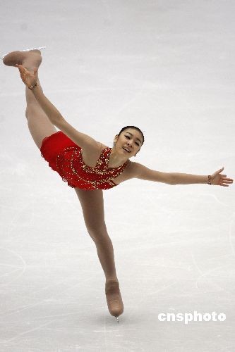 10月8日,2008中國杯世界花樣滑冰大獎賽在北京首都體育館進行第三天的爭奪,在女子單人滑比賽中,韓國選手金妍兒獲得冠軍。她的短節目得分為63.64分,今天的自由滑得分為128.11分,總分191.75分。金妍兒已經連續兩年蟬聯世界花樣滑冰大獎賽總決賽的冠軍,今天再度中國站封后。圖為金妍兒在自由滑比賽中。中新社發 盛佳鵬 攝