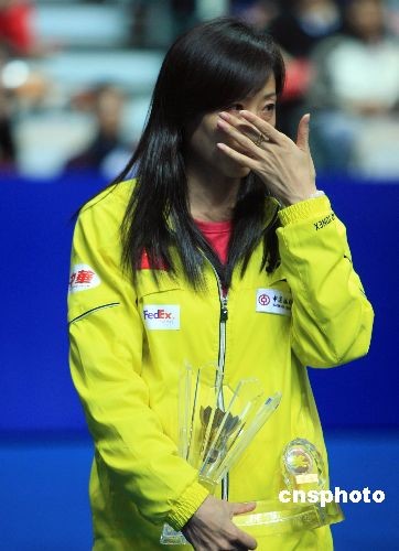 圖為雅典奧運(yùn)、北京奧運(yùn)女單冠軍張寧揮淚告別羽壇。