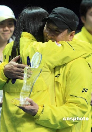 圖為雅典奧運(yùn)、北京奧運(yùn)女單冠軍張寧與恩師李永波深情相擁。