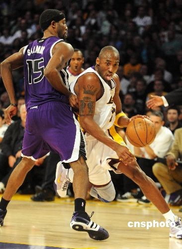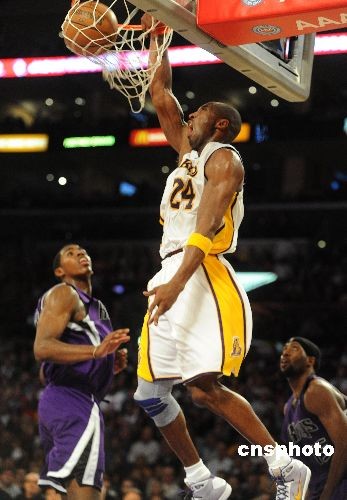 當地時間十一月二十三日晚,NBA洛杉磯湖人隊在主場迎戰薩克拉門托國王隊。最終湖人隊以一百一十八比一百零八擊敗國王隊,迎來四連勝,國王遭遇兩連敗。科比此役得到二十四分和六次助攻。中新社發 張煒 攝
