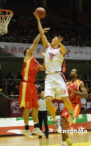 12月5日,2008—2009賽季CBA聯賽第九輪在山東濟南的一場比賽中,主場作戰的山東黃金隊以108比78戰勝青島雙星隊。中新社發 張侃 攝