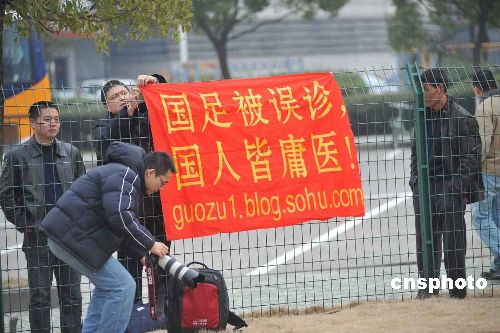 1月21日,國足將在杭州黃龍體育中心應(yīng)戰(zhàn)亞洲杯預(yù)選賽的第二個對手越南隊。今天,國足來到體育場開始簡單熱身,F(xiàn)場球迷拉起橫幅“國足被誤診 國人皆庸醫(yī)”,國足隊員先后步入球場,執(zhí)著的球迷依然撐著橫幅,站在場外。 中新社發(fā) 陳穎 攝