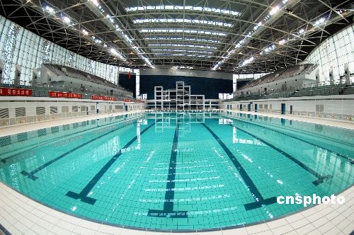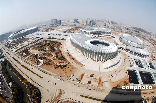 2009年3月25日,在濟(jì)南奧體中心舉行了網(wǎng)球館、游泳館、中心廣場(chǎng)工程竣工暨管理交接儀式。當(dāng)天是第十一屆全運(yùn)會(huì)倒計(jì)時(shí)200天,作為主會(huì)場(chǎng)的濟(jì)南奧體中心比賽場(chǎng)館建設(shè)已進(jìn)入收尾階段,設(shè)計(jì)的“東荷西柳”建筑景觀初現(xiàn)規(guī)模。中新社發(fā) 龔輝 攝