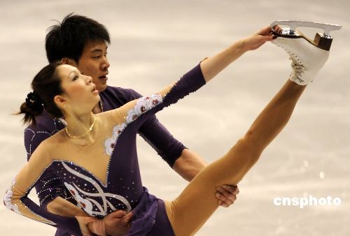 當地時間三月二十五日晚,在二00九年花樣滑冰世界錦標賽雙人滑決賽中,中國選手張丹/張昊獲得亞軍。中新社發 張煒 攝