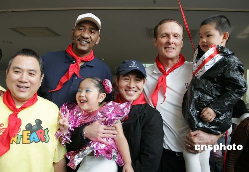 圖為李連杰與NBA球星喬治·格爾文(左二)、瑞克·巴里(右二)等與上海孩子合影。