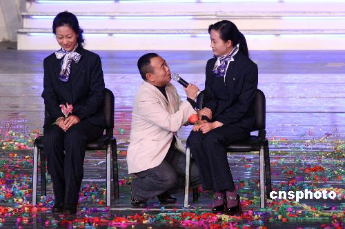 1月9日,2008年新春文藝晚會在河南藝術中心大劇院舉行,潘長江和在晚會現場找來的比自己小24歲的年輕媽媽以及一名20多歲的年輕媳婦作為搭檔共同表演小品《兩個對我恩重如山的女人》。中新社發 陳代述 攝