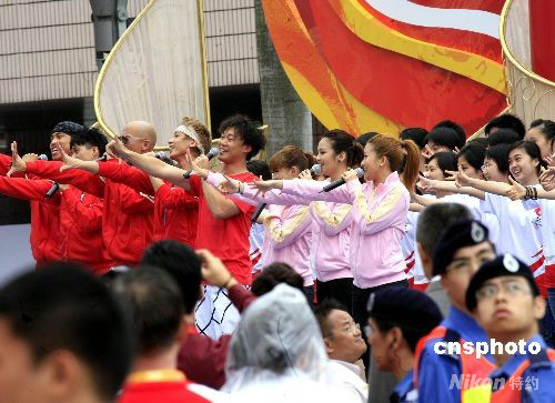 五月二日上午,2008北京奧運圣火中國境內首站(香港)傳遞正式開始,尖沙咀火炬起跑點舉行盛大開跑儀式,香港歌手陳奕迅與眾多藝人演唱,為奧運火炬傳遞造勢。中新社發 王麗南 攝