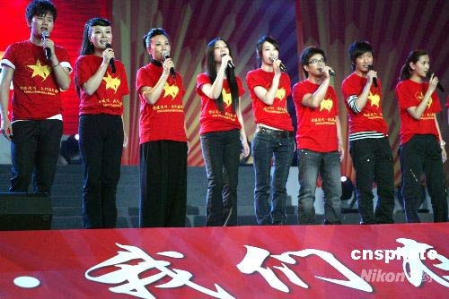 5月25日晚,由13家國(guó)家一級(jí)社會(huì)組織共同主辦的“情暖汶川·我們?cè)谛袆?dòng)——全國(guó)社會(huì)組織抗震救災(zāi)募捐義演”在北京首都體育館舉行,來(lái)自社會(huì)各界的1萬(wàn)余名觀眾參加了此次募捐活動(dòng)。現(xiàn)場(chǎng)籌得款物將通過(guò)中華慈善總會(huì)全部捐給地震災(zāi)區(qū)。中新社發(fā) 趙雋 攝