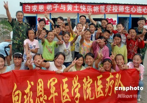 解放軍石家莊白求恩軍醫學院派出的心理支援隊,近日來到四川省安縣黃土鎮“快樂帳篷學!,向孩子履行心理支援義務,收到良好效果。中新社發 尹威華 攝