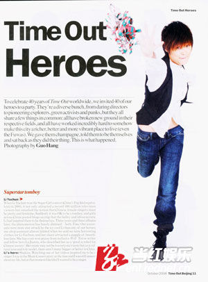 在榮登美國《時代周刊》及英國《Glamour》等眾多國際知名雜志封面之后,李宇春近日再被英國知名雜志《TIME OUT》選中,作為該雜志40周年的北京特刊封面人物,與章子怡、陳凱歌、崔健等同時出現在中國版的英文刊封面上。