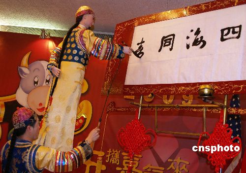 1月16日,中國(guó)駐洛杉磯總領(lǐng)館舉行“2009華僑華人新春招待會(huì)”,中領(lǐng)館多功能大廳大紅燈籠高高掛,充滿濃濃的過(guò)年味。總領(lǐng)事張?jiān)坡嗜w領(lǐng)事與600多位華人華僑代表歡聚一堂,共慶牛年的到來(lái)。中新社發(fā) 盧威 攝