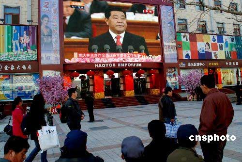 3月3日下午,中國人民政治協商會議第十一屆全國委員會第一次會議在北京人民大會堂開幕,舉國上下關注“兩會”。圖為一些農民工在王府井好友世界商場前的大屏幕下觀看全國政協開幕會實況直播。中新社發 楊慧峰 攝