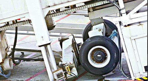 桃園國際機場航空站副主任張鐵源表示,經查是空橋支柱與輪子間銜接處斷裂,初步排除是維修保養(yǎng)不足釀禍,今將請空橋韓國原廠代理商到現(xiàn)場檢測,調查真正原因。