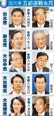 據了解,黨中央規劃的陣容,大高雄市由王金平出任,臺北市由吳伯雄擔任,新北市交給吳敦義負責,大臺中市是由曾任臺中縣長的廖了以擔綱,大臺南市則由出身嘉義市的蕭萬長出馬。