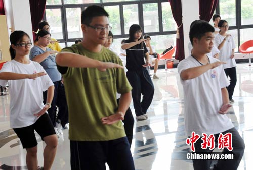 中新網(wǎng)7月5日電 7月5日,32名參加“2010年海峽兩岸青年聯(lián)歡節(jié)•中醫(yī)藥傳統(tǒng)文化研習營”的臺灣高校學子在福建中醫(yī)藥大學福州旗山校區(qū)學練24式太極拳。