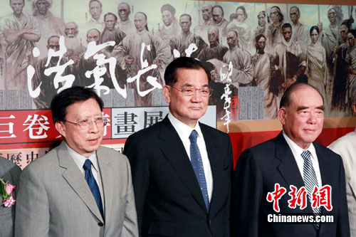 中新社臺北7月7日電(記者 黃少華)7日是中國抗日戰爭全面爆發73周年。由大陸民間繪制、長逾800米的“浩氣長流•抗戰巨卷史詩畫展”在臺北開幕。中國國民黨榮譽主席連戰、臺灣文化總會會長劉兆玄、曾參與抗戰的前臺灣軍方參謀總長郝伯村出席致辭時提到,那場為了國家民族尊嚴與生存而艱苦奮斗的抗戰歷史不應忘記。兩岸當共同弘揚中華文化,促進和平發展。