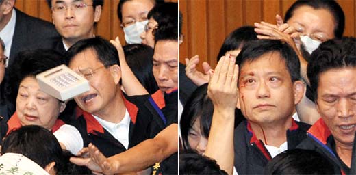 中新網7月9日電 據臺灣《聯合報》報道,臺灣“立法院”昨天為了審議兩岸經濟合作框架協議(ECFA)爆發肢體沖突,國民黨“立委”吳育升被砸傷眼角,民進黨“立委”郭玟成攀爬主席臺時摔落。砸傷吳育升的民進黨“立委”黃偉哲表示,深感遺憾與歉意,愿意賠償醫藥費。