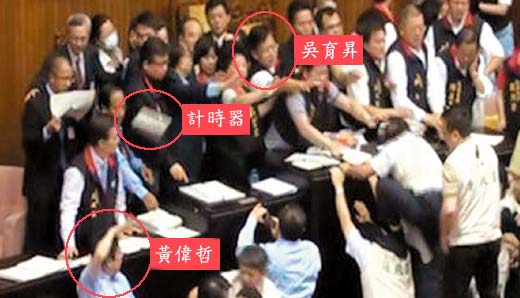 國民黨昨晚檢視錄像帶,原來是黃偉哲以“勾射”方式,冷不防向國民黨“立委”群集處拋出定時器,不偏不倚砸中吳育升頭部。