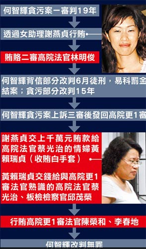 特偵組透露,何智輝為了不被關,以自己的女助理謝燕貞當行賄白手套,先行賄二審擔任受命法官的林明俊,林在何智輝所涉背信罪的部分,從一審判決2年到二審改判1年,然后適用2007年減刑條例,減為6個月,最后都獲易科罰金,貪污則改判15年。