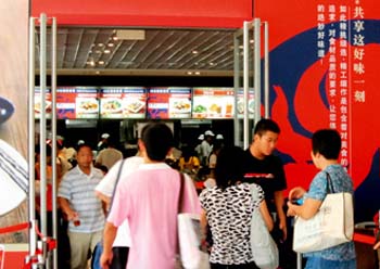 上海天氣炎熱,游客看世博熱情不減。進(jìn)入世博園區(qū)發(fā)現(xiàn),世博美食正掀起面食大戰(zhàn),四川擔(dān)擔(dān)面、蘭州拉面等各種知名面食在園區(qū)擺開架式招攬食客,臺(tái)灣牛肉面也因?yàn)榭谖兜氐溃擞慰偷哪抗狻_@其中最紅火的就有康師傅私房牛肉面、真鍋咖啡和老董牛肉面三家。