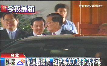 等到要離開時,他只能挨著連戰,肩并肩的走,看他臉紅紅走不穩,似乎只剩下這一抹微笑,在說“我沒醉、沒醉啦”。