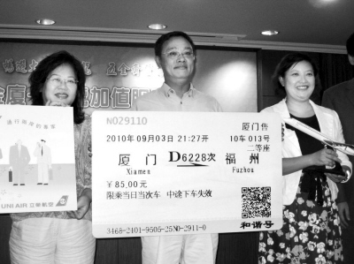 “11年前我就是搭第一班‘小三通’輪船去福州,今天(9月3日)又在臺灣買到了第一張動車火車票,真是感慨萬分。我上次回福州還要自己在廈門排隊買車票,這次就不用了,真是太方便啦。”3日上午,福州臺商張鳴齡先生興奮地從臺灣三菱旅行社總經理周惠全手里接過車票模型,宣告大陸動車車票在臺灣正式開賣。