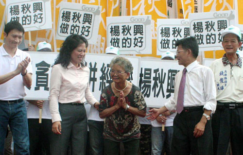 楊秋興83歲慈母楊王春還親自為楊披掛彩帶,她感性地表示,他把兒子交給大家,希望在眾人栽培下,能當選市長為民服務。
