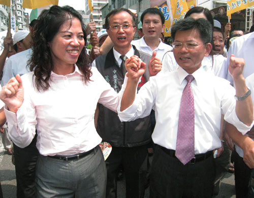 楊秋興與大批支持者緩步走進“選委會”完成登記手續,正式確定大高雄市長選盤的三強鼎立局面。