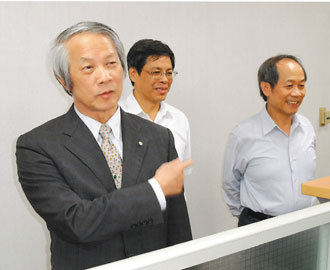 臺前“中選會主委”賴浩敏(左)12日到“中選會”員工辦公室辭行,他對“中選會代理主委”劉義周(右)說,不只選舉要辦得好,也要讓工作“和和樂樂”。 圖片來源:臺灣《聯合報》