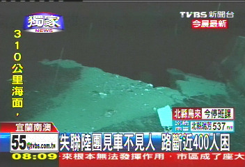 中新網10月22日電 據臺灣TVBS報道,宜蘭大淹水,蘇花公路更是處處坍方,甚至傳出有大陸游客團的游覽車受困。該媒體記者挺進現場,只看到游覽車空車,人員不知去向,不知是否平安;臺九線大約115公里處,部分路段的路基完全被淘空,土石滑落一兩百米的山下,附近路面更變成小溪、不斷淹水。